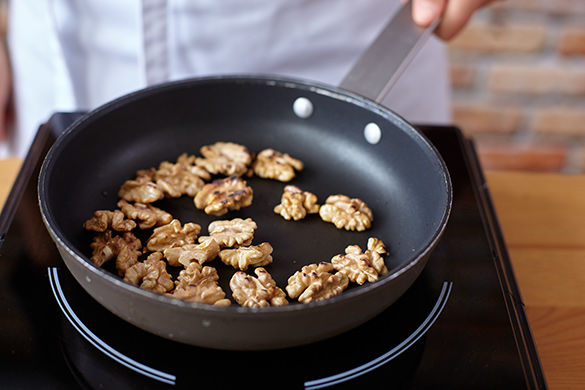 Inzwischen Walnüsse in eine kleine Pfanne geben und bei mittlerer Hitze goldbraun rösten. Walnüsse grob hacken und zusammen mit dem Bulgur zu dem Gemüse in die Schüssel geben. Zitrone in eine kleine Schüssel pressen.