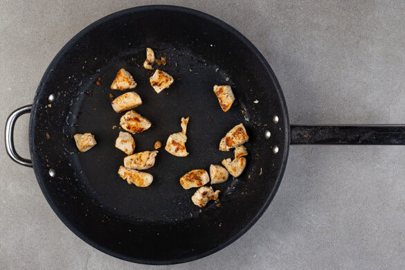 Das Fleisch trocken tupfen und in einer großen Pfanne mit 2EL Olivenöl bei mittlerer Hitze 3–5Min. gar und goldbraun braten, dabei gelegentlich umrühren. Mit je 1 kräftigen Prise Salz und Pfeffer würzen.