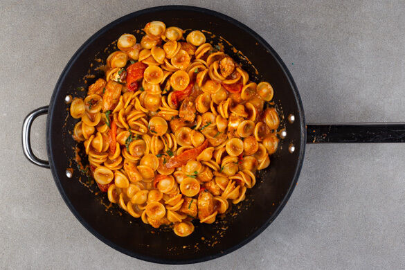 Ein Rezept, das alle Esser am Tisch glücklich macht, ist nicht immer leicht zu finden. Unsere niedliche Orecchiettepasta in der unkompliziert zubereiteten Sauce aus gegrillter Paprika mit cremigem Fetakäse wird aber garantiert von allen mit Komplimenten überhäuft! Zur Vollendung darf sich ein köstlicher Mix aus Basilikum, Feta und Rauchmandeln mit der Sauce und zarter Hähnchenbrust vermählen. Zufrieden? Oh ja!