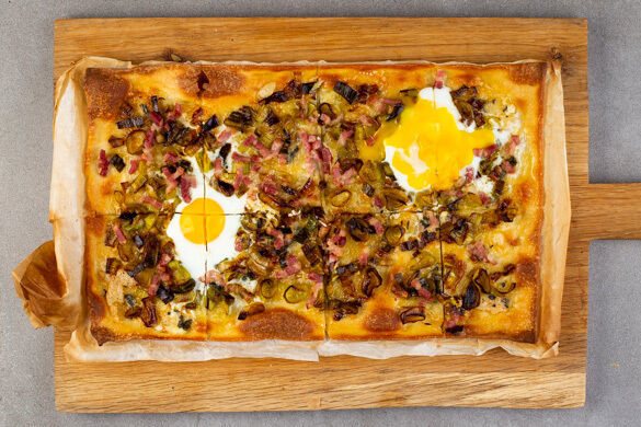 Bodenständig und herzhaft, so präsentiert sich unser Flammkuchen. Wir belegen den Teig heute mit gebratenem Lauch, würzigem Blauschimmelkäse und Baconstreifen. Und dann ab in den Ofen. Doch halt! Wir haben noch eine kleine, exquisite Überraschung parat: Sie kommt in Form von leckeren Bio-Eiern, die gegen Ende der Garzeit auf dem Flammkuchen mitgebacken werden. Herz, was willst du mehr?