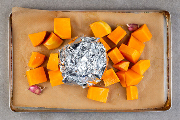 Den Kürbis schälen, halbieren und entkernen, dann in ca. 3cm große Stücke schneiden. Mit 1EL Olivenöl und 1/2TL Salz vermengen und nach ca. 60Min. Backzeit mit dem ungeschälten Knoblauch um den Sellerie auf dem Backblech verteilen. Den Knoblauch nach ca. 25Min. aus dem Ofen holen. Den Sellerie und den Kürbis weitere ca. 10Min. backen, bis das Gemüse sehr weich ist.