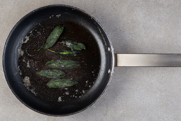 Währenddessen die Salbeiblätter abzupfen und in der Pfanne mit 1EL Butter bei mittlerer bis niedriger Hitze auf jeder Seite 3–4Min. knusprig anbraten, dabei die Salbeiblätter mit einer Gabel leicht in das heiße Fett drücken. Auf Küchenkrepp abtropfen lassen und mit 1 Prise Salz würzen. Die Salbeibutter aufbewahren.