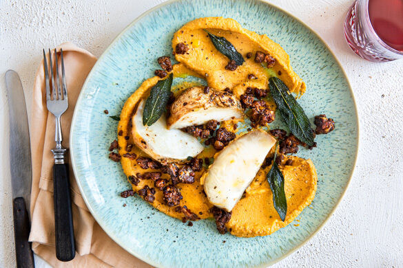 Dieses Winteressen verspricht Behaglichkeit für Leib und Seele. Wie gemütlich doch die Zeit vergeht, wenn du den Knollensellerie liebevoll mit einer köstlichen Mischung aus Blauschimmelkäse, Wal- und Pekannüssen einsalbst und ihn dann ganz geruhsam im Ofen schmorst! Mühelos röstest du Knoblauch und Kürbis gleich mit und verwandelst sie in ein traumhaft cremiges Püree. Mit Salbeisauce beträufelt ein absoluter Traum.