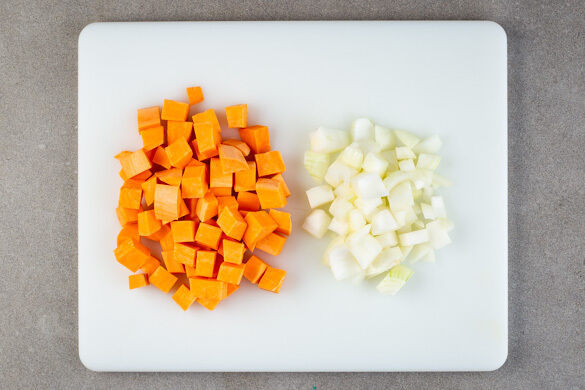 Die Süßkartoffel schälen und in ca. 1cm große Stücke schneiden. Die Zwiebel schälen, halbieren und grob würfeln.
