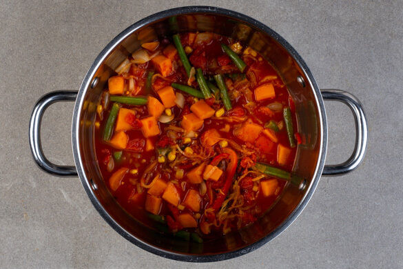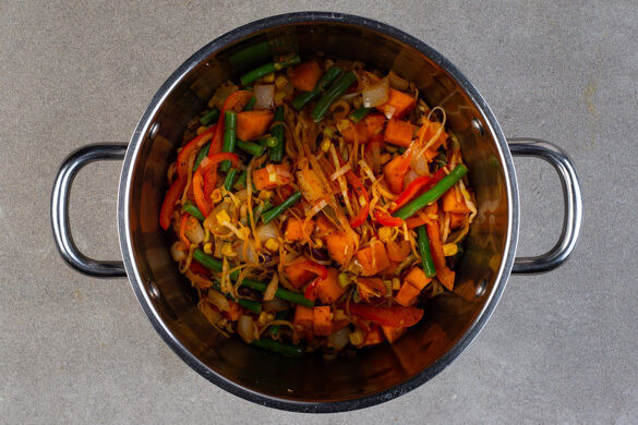 Die Süßkartoffeln mit den Zwiebeln in einem mittelgroßen Topf mit 1EL Pflanzenöl und 1 Prise Salz bei mittlerer bis starker Hitze ca. 3Min. anschwitzen. Den Gemüsemix zugeben und ca. 3Min. mitbraten, dann 1EL der Gewürzmischung in den Topf rühren und ca. 1Min. erhitzen.