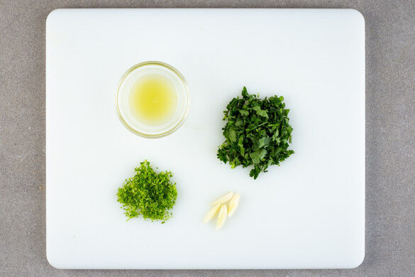 Den Koriander samt Stängeln grob schneiden. Den Knoblauch schälen und vierteln. Die Limettenschalen abreiben, dann die Limetten halbieren und auspressen.
