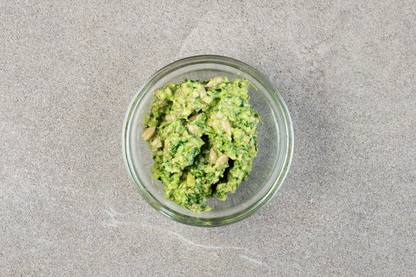 2EL Sonnenblumenkerne, den Koriander, den Knoblauch, 1EL Limettenschale und 2EL Limettensaft in einem hohen Gefäß mit einem Stabmixer grob pürieren. 2EL Pflanzenöl und 1/2TL Salz zugeben und zu einem dickflüssigen Pesto pürieren.