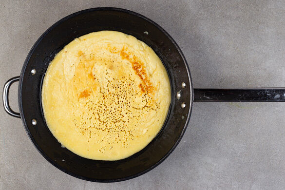 Je 1EL Butter in der Pfanne sowie einer weiteren großen Pfanne bei niedriger bis mittlerer Hitze schmelzen. Jeweils die 1/2 des Teiges zugeben und abgedeckt 6–8Min. ausbacken, dann die Deckel abnehmen und weiterbraten.