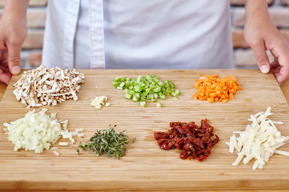 Ausreichend, gesalzenes Wasser in einem großen Topf zum Kochen bringen. Pilze putzen, Karotte schälen, beides grob raspeln. Knoblauch und Zwiebel schälen, fein hacken. Sellerie fein hacken. Getrocknete Tomaten abtropfen lassen und in Streifen schneiden. Blätter vom Thymian grob von den Stielen streifen. Käse reiben.