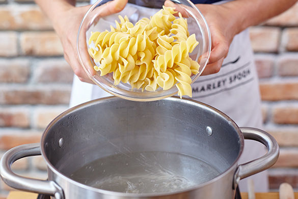 Sobald das Wasser kocht, die Pasta zugeben und für ca. 8-11Min. bissfest kochen. Die Pasta durch ein Sieb abgießen und dabei eine Tasse Kochwasser auffangen.