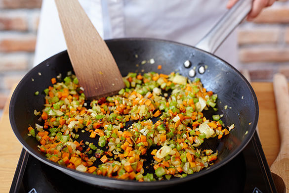 Inzwischen große Pfanne mit 1-2EL Öl auf mittlere Stufe erhitzen. Zwiebel, Karotten und Sellerie ca. 4-5Min. unter ständigem Rühren anbraten.