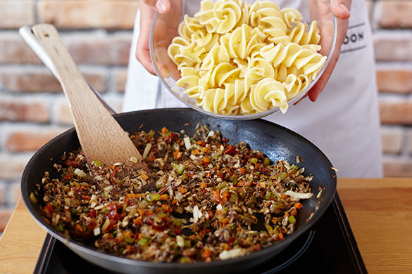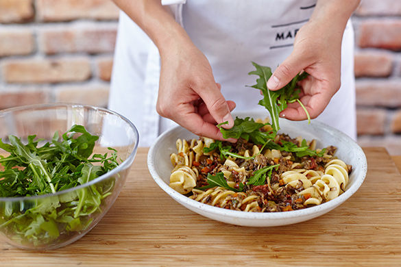 Wir können gar nicht genug bekommen von der Veggie-Pasta, die aus frischen Pilzen und Gemüse gekocht wird. Die Korkenzieher-ähnlichen Nudeln sehen nicht nur lustig aus, sondern saugen die köstliche Sauce so richtig schön auf. Dazu gibt es noch eine Portion Rucola-Salat und es werden auch die Kleinsten satt.