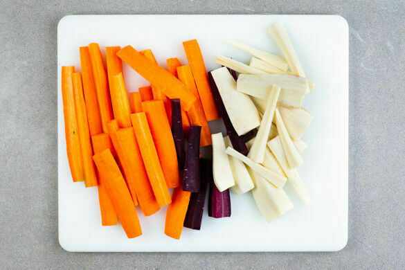 Den Backofen auf 240°C (220°C Umluft) vorheizen. Die Petersilienwurzeln schälen. Die Karotten und die lila Karotten ggf. schälen und das Gemüse längs vierteln. Große Stücke ggf. quer halbieren.