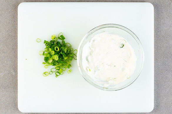 Den Backofen auf 200°C (180°C Umluft) vorheizen. Die Lauchzwiebel in feine Ringe schneiden. Den Meerrettich schälen und fein reiben. Die 1/2 der Lauchzwiebeln mit der Crème fraîche und Meerrettich nach Geschmack verrühren.