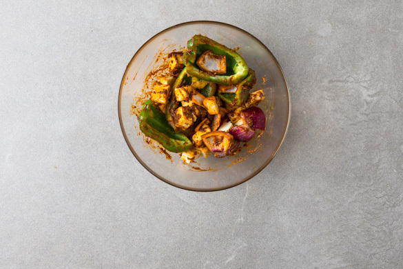 Den Paneer-Käse in 2–3cm große Stücke schneiden und mit der Paprika, den Zwiebeln und der Tikka-Masala-Paste nach Geschmack vermengen.