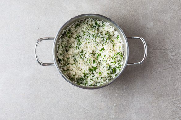 In einem mittelgroßen Topf 600ml leicht gesalzenes Wasser zum Kochen bringen. Den Reis in einem Sieb kalt abspülen, bis das Wasser klar bleibt. Sobald das Wasser kocht, den Reis hineingeben und abgedeckt bei niedrigster Hitze 10–12Min. kochen, bis das Wasser aufgesogen und der Reis gar ist. Noch ca. 5Min. ohne Hitzezufuhr ziehen lassen.