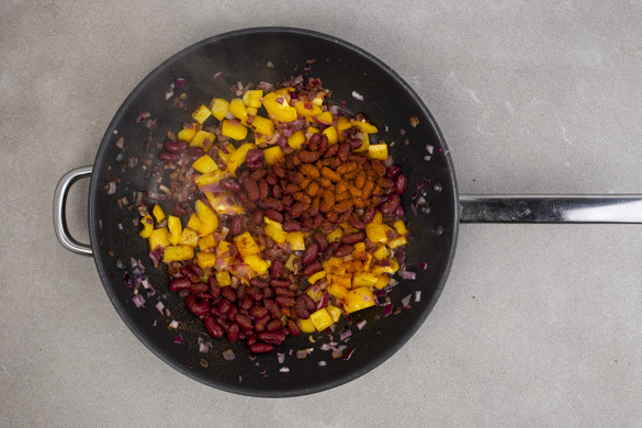 Die Paprika, die Zwiebeln und den Knoblauch in einer großen Pfanne mit 1EL Olivenöl bei starker Hitze 2–3Min. anbraten, bis das Gemüse weich ist. Die Bohnen und die Gewürzmischung unterrühren und alles bei mittlerer Hitze 6–8Min. sanft köcheln lassen. Die 1/2 der Bohnenflüssigkeit unter das Chili rühren, bei Bedarf auch etwas mehr.
