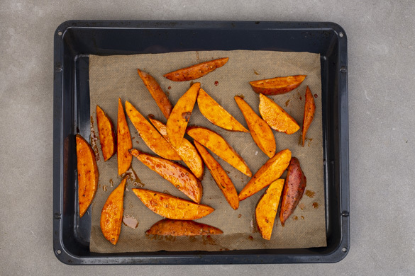 Den Backofen auf 220°C (200°C Umluft) vorheizen. Die Süßkartoffeln samt Schale längs halbieren, in 1–2cm dicke Spalten schneiden und auf ein mit Backpapier ausgelegtes Backblech geben.