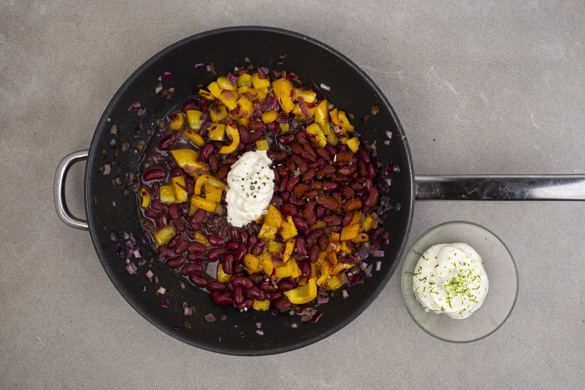 Die Paprika, die Zwiebeln und den Knoblauch in einer großen Pfanne mit 2EL Olivenöl bei starker Hitze 2–3Min. anbraten, bis das Gemüse weich ist. Die Bohnen und die Gewürzmischung unterrühren und alles bei mittlerer Hitze 6–8Min. sanft köcheln lassen. Die 1/2 der Bohnenflüssigkeit unter das Chili rühren, bei Bedarf auch etwas mehr.