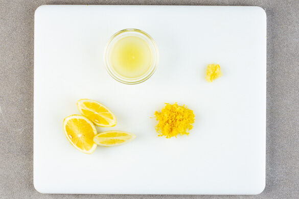 Den Backofen auf 220°C (200ºC Umluft) vorheizen. In einem kleinen Topf ausreichend Wasser für die Eier zum Kochen bringen. Die Zitronenschale abreiben und die Zitrone halbieren, eine Hälfte auspressen, die andere Hälfte in Spalten schneiden. Den Knoblauch schälen und fein reiben.