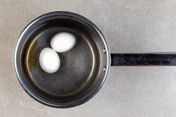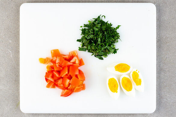 Die Eier vorsichtig in das kochende Wasser geben und in ca. 6Min. wachsweich kochen. Die Eier in ein Sieb abgießen und kalt abschrecken.