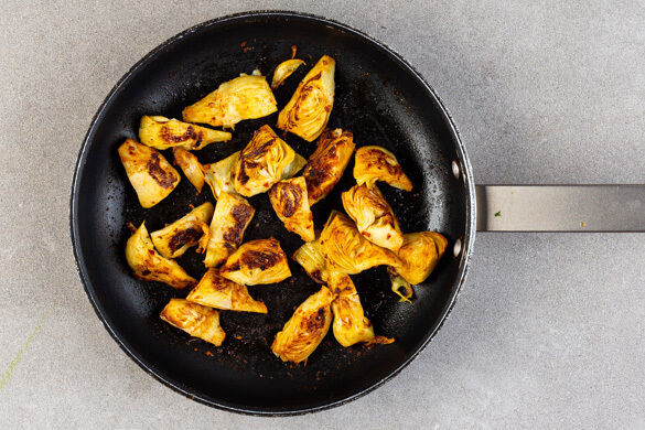 Die Artischocken in einem Sieb abtropfen lassen, dabei mit einer Tasse etwas Artischockenöl auffangen. Die Artischocken mit 1EL Artischockenöl vermengen und in einer mittelgroßen Pfanne mit 1TL der Gewürzmischung und je 1 Prise Salz und Pfeffer bei mittlerer bis starker Hitze auf jeder Seite ca. 3Min. scharf anbraten.