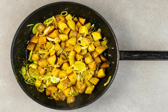 Die Mandelblättchen in einer großen Pfanne ohne Zugabe von Fett bei mittlerer Hitze 1–2Min. goldbraun anrösten, herausnehmen und beiseitestellen. Den Lauch in der Pfanne mit 4EL Pflanzenöl und 1 kräftigen Prise Salz bei mittlerer Hitze ca. 2Min. anbraten. Die Kartoffeln dazugeben und 6–8Min. mitbraten. Das Currypulver während der letzten Minute zugeben und mitbraten.