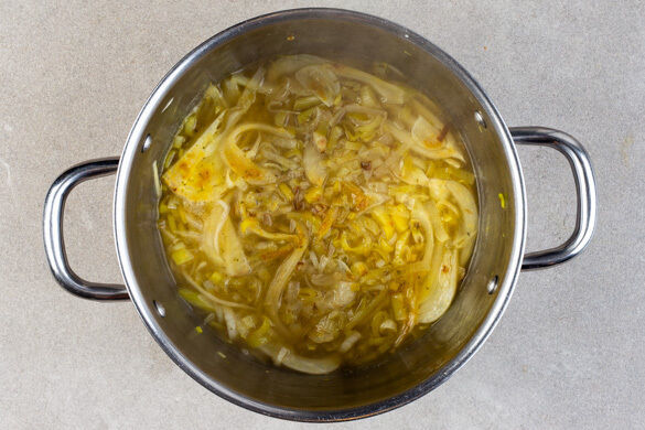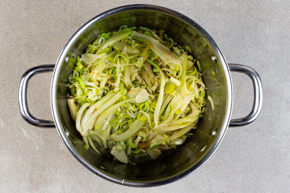 Die Bällchen aus dem Topf nehmen und abgedeckt warm halten. Den Lauch, den Knoblauch und die 1/2 des Fenchels in demselben Topf mit je 1 Prise Salz und Pfeffer bei mittlerer Hitze 4–6Min. goldbraun und weich braten, dabei gelegentlich umrühren.