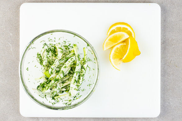 Die 1/2 des Dills samt Stängeln grob schneiden. Tipp: Der übrige Dill kann für einen späteren Zeitpunkt eingefroren werden. Die Zitrone halbieren und eine Hälfte in Spalten schneiden, die andere Hälfte auspressen. Den Dill mit dem restlichen Fenchel und 1EL Zitronensaft vermengen. Das Relish mit Salz und Pfeffer abschmecken.