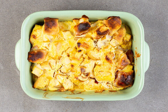 Die Birnen, die Brötchenwürfel und die Ricotta-Mischung gründlich vermengen und in einer mittelgroßen Auflaufform im Ofen 24–30Min. backen, bis der Ricotta gestockt ist. Den Brotpudding mit Alufolie abdecken, falls er zu schnell dunkel wird.