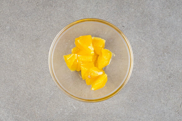 Die übrige Orange schälen und das Fruchtfleisch grob würfeln.