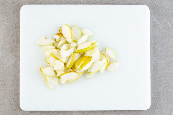 Den Backofen auf 190°C (170°C Umluft) vorheizen. In einem großen Topf ausreichend gesalzenes Wasser für die Pasta zum Kochen bringen. Die Birnen vierteln, entkernen und in ca. 0,5cm dünne Scheiben schneiden. Die Zwiebeln schälen, halbieren und fein würfeln.