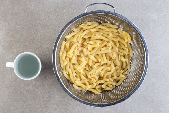 Die Pasta in das kochende Wasser geben und in 6–8Min. bissfest kochen. Mit einer Tasse etwas Pastawasser abschöpfen, dann in ein Sieb abgießen und abtropfen lassen.