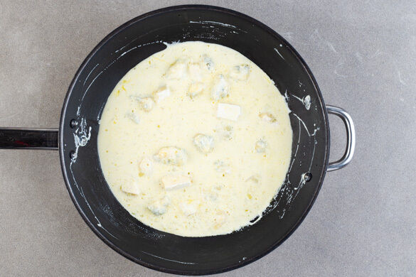 Die Zwiebeln in der Pfanne mit 1EL Olivenöl bei mittlerer Hitze 2–3Min. glasig anschwitzen. Die Crème fraîche unterrühren und 3–4Min. köcheln lassen. Dann den Käse in die Pfanne bröseln, unterrühren und die Sauce noch kurz weiter köcheln lassen, bis der Käse geschmolzen ist.