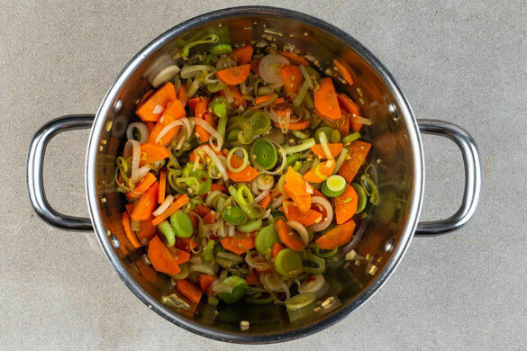 Den Knoblauch, den Ingwer, die 1/2 der Chilischote oder mehr nach Geschmack sowie die Thymianzweige in den Topf geben und mit 2EL Pflanzenöl bei mittlerer Hitze ca. 1Min. unter Rühren anbraten. Die Karotten und den Lauch mit je 1 Prise Salz und Pfeffer dazugeben und weitere 1–2Min. mitbraten.