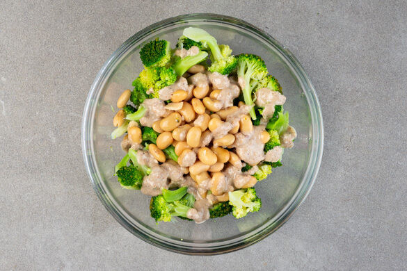 Die Bohnen im Sieb mit kaltem Wasser abspülen, abtropfen lassen und zum Brokkoli geben. Das Dressing hinzufügen und alles gut vermengen.