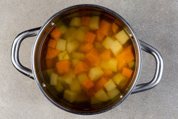 Den Backofen auf 220°C (200ºC Umluft) vorheizen. In einem mittelgroßen Topf ausreichend gesalzenes Wasser für das Gemüse zum Kochen bringen. Die Süßkartoffel und die Pastinake schälen und in ca. 2cm große Würfel schneiden. Das Gemüse in das kochende Wasser geben und in 14–16Min. gar kochen.