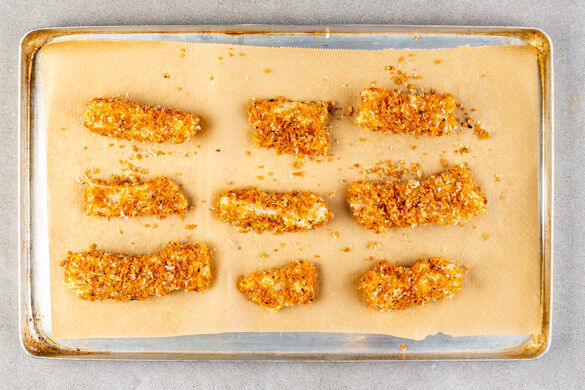 Das Panko-Paniermehl gleichmäßig auf einem mit Backpapier ausgelegten Backblech verteilen und 2–4Min. goldbraun rösten. Den Käse fein reiben und auf einem Teller mit dem Paniermehl, der Gewürzmischung, 1EL Olivenöl und 1 kräftigen Prise Salz vermengen.