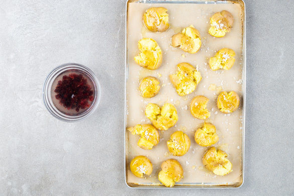 Die Kartoffeln in ein Sieb abgießen und auf ein mit Backpapier ausgelegtes Backblech geben. Mit der Unterseite des Topfes leicht platt drücken und mit 1–2EL Olivenöl sowie 1 kräftigen Prise Salz vermengen, dann im Ofen ca. 15Min. backen. Die Cranberrys in 100ml heißem Wasser einweichen.