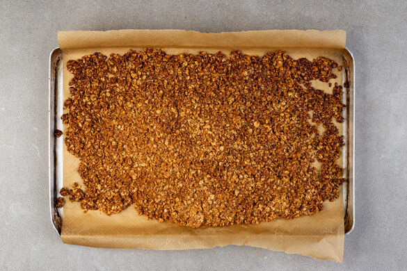 Die Haferflocken mit der Butter vermengen, dann auf einem mit Backpapier ausgelegten Backblech verteilen und im Ofen 16–20Min. goldbraun backen. Die Haferflocken abkühlen lassen und in kleine Stücke zerkrümeln.