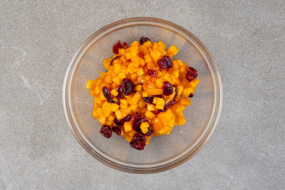 Die Kakis schälen und in kleine Würfel schneiden. Die Cranberrys in ein Sieb abgießen, abtropfen lassen und trocken tupfen, dann mit den Kakis und 4TL Honig vermengen.