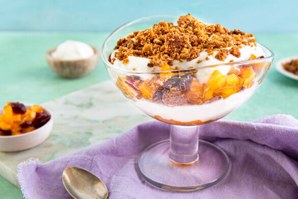Cranachan ist ein typisch schottisches Schichtdessert, das traditionell mit Himbeeren und Whisky zubereitet wird. Wir wagen uns an eine winterliche Neuinterpretation und nehmen Cranberrys und Kaki. In Kombination mit buttrigen, gebackenen Haferflocken und einem cremigen Mix aus griechischem Joghurt und Schlagsahne, ist dieser Nachtisch eine Wohltat für die Geschmacksknospen! Der Whisky ist natürlich optional. Slàinte Mhath!