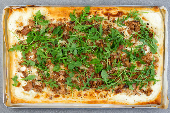Pizza bianca mit Feta und Thunfisch auf Crème fraîche mit Walnuss, dazu Rucola