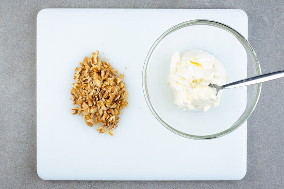 Die Walnüsse grob hacken oder in der Packung mit den Fingern zerdrücken. Den Knoblauch schälen und durch eine Knoblauchpresse drücken oder sehr fein würfeln. Die Crème fraîche mit dem Knoblauch verrühren.