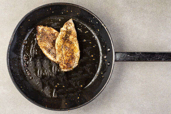 Das Fleisch trocken tupfen und horizontal halbieren, dann mit der Gewürzmischung, 1EL Olivenöl und je 1 Prise Salz und Pfeffer einreiben. Das Fleisch in einer mittelgroßen Pfanne bei mittlerer bis starker Hitze 3–4Min. auf jeder Seite gar und goldbraun braten.