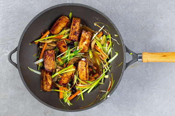 Den Tofu in einer großen Pfanne oder einem Wok mit 1EL Pflanzenöl bei mittlerer Hitze ca. 5Min. knusprig anbraten. Die Karotten und den Knoblauch dazugeben und ca. 1Min. mitbraten, dann den Lauch und die Pilze untermengen.