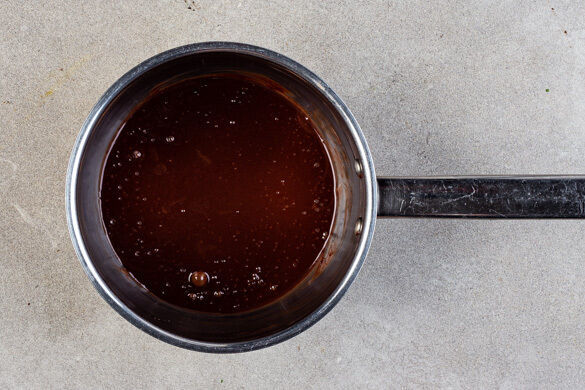 Den Backofen auf 190°C (170°C Umluft) vorheizen. Den Boden und die Seiten einer Auflaufform mit 1TL Butter einfetten. Die 1/2 der Sahne in einem kleinen Topf bei mittlerer Hitze erwärmen. Die Schokodrops hinzufügen und so lange rühren, bis die Schokolade geschmolzen ist. Den Topf vom Herd nehmen und zum Abkühlen beiseitestellen. Die übrige Sahne im Kühlschrank aufbewahren.