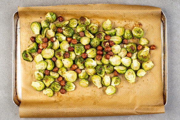 Den Rosenkohl halbieren, auf einem mit Backpapier ausgelegten Backblech mit 2EL Olivenöl, 1/2TL Salz und 1 kräftigen Prise Pfeffer vermengen und im Ofen 10–12Min. backen. Die Haselnüsse untermengen und den Rosenkohl mit den Nüssen weitere 5Min. rösten.