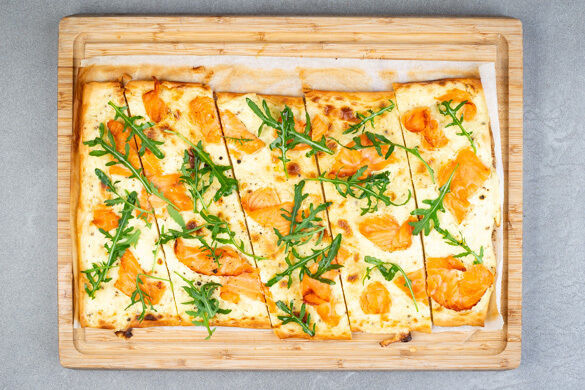 Die Lachsschnetzel gleichmäßig auf dem Flammkuchen verteilen und den Flammkuchen im Ofen 15–20Min. backen, bis er goldbraun und knusprig ist.