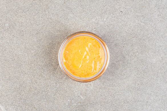 Die Wasabipaste mit 1EL Mayonnaise, 1TL hellem Essig und Salz nach Geschmack verrühren. Die 1/2 der Gurke quer in dünne Scheiben schneiden. Tipp: Wer großen Hunger hat, kann auch mehr Gurke verwenden. Die Gurke und das Dressing bis zum Servieren separat beiseitestellen.